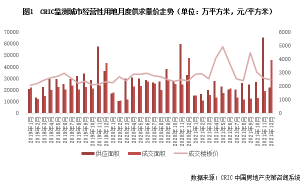 供應方面,重點城市第三輪供地高峰已過,加之臨近年關影響,大多數城市均放緩了供地節奏,致12月份土地市場供應量環比周期性下滑,且不及去年同期。據CRIC統計數據顯示,12月全國土地市場經營性土地供應總建筑面積22016萬平方米,環比下降66%,同比也下降33%。重點城市集中供地方面,本月僅有寧波一城推出了第三批集中供應地塊,總建面達336萬平方米,涉及38宗地,其中商品住宅用地僅有15幅,其余地塊則均為安置、租賃、共有產權等保障性住房用地,保障住房用地供應力度明顯增加。