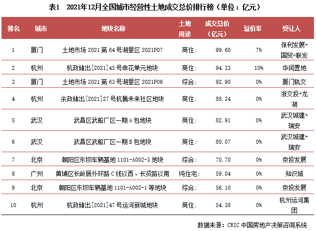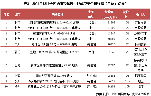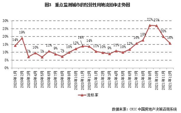 2021年12月,在17城三輪集中土拍收官及三四線城市土地成交放量的拉動下,年末土地成交翹尾現象如期而至,當月成交規模突破4億平方米,同比也僅下降了3%。與此同時,信貸環境邊際改善下,土地流拍現象也有所好轉,集中土拍的重點城市中僅個別城市流拍率較上一輪大增。