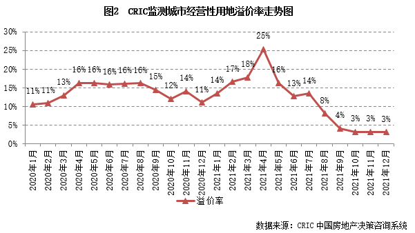 市場熱度方面。盡管多個重點城市三批次集中土拍規則略有松綁,但受多數房企資金壓力仍舊較大影響,多數城市的土拍熱度并未較二輪明顯提升,而成交主力中小城市土地市場亦維持在低熱狀態。因此,土地成交溢價率仍延續低位運行,12月平均溢價率為3.2%,與上月持平,與去年同期相比,溢價率下降了近8個百分點。
