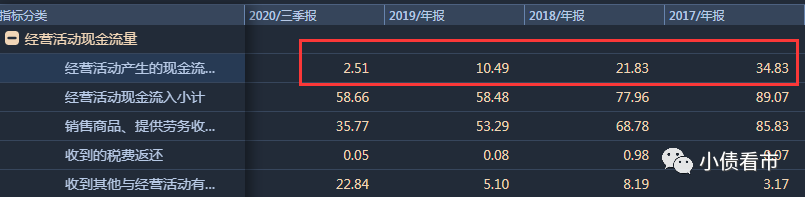 值得注意的是,在業績下滑的同時,鵬博士的經營獲現能力也在不斷惡化。其經營性現金流凈額從2015年的46.58億一直下滑至2019年的10.49億元,2020年前三季度僅錄得2.51億元。