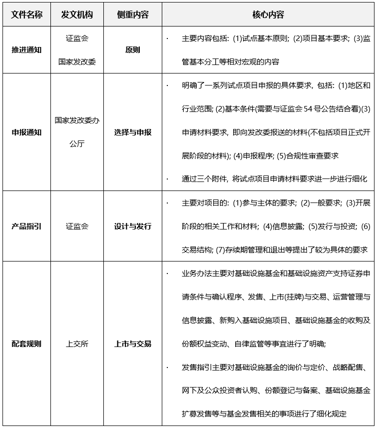 結(jié)合此前已經(jīng)頒布的包括《關(guān)于推進(jìn)基礎(chǔ)設(shè)施領(lǐng)域不動產(chǎn)投資信托基金(REITs)試點(diǎn)相關(guān)工作的通知》(“40號通知”或“推進(jìn)通知”)、《關(guān)于做好基礎(chǔ)設(shè)施領(lǐng)域不動產(chǎn)投資信托基金(REITs)試點(diǎn)項目申報工作的通知》(“586號文”或“申報通知”)、《公開募集基礎(chǔ)設(shè)施證券投資基金指引(試行)》(“54號公告”或“產(chǎn)品指引”), 我們認(rèn)為, 配套規(guī)則和上述規(guī)范性文件, 具有清晰的層次和明確的分工, 分別從原則、選擇與申報、設(shè)計與發(fā)行、上市與交易的角度, 共同完善并構(gòu)成了公募REITs業(yè)務(wù)的規(guī)則體系。