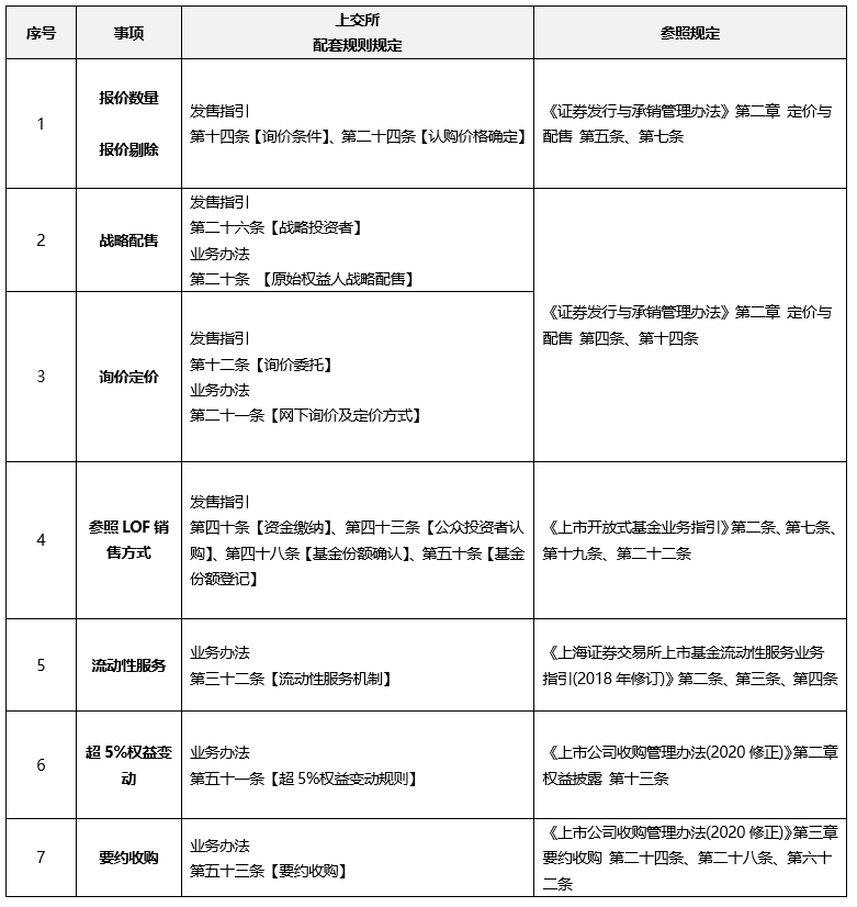 從思路來看, 配套規(guī)則總體采取了“比照股性規(guī)則, 搭建獨(dú)立體系”的總體立法思路。在業(yè)務(wù)辦法中, 比照了公開發(fā)行證券要求建立掛牌和上市審查制度, 但在全流程重要節(jié)點(diǎn)和關(guān)鍵環(huán)節(jié)規(guī)范與權(quán)責(zé)分配的角度, 保留了REITs產(chǎn)品的特殊性特色。在發(fā)售指引中, 借鑒了股票定價和LOF基金發(fā)售, 對公募REITs的詢價和定價進(jìn)行了規(guī)范, 但同時在投資者報價個數(shù)要求、報價剔除、戰(zhàn)略配售機(jī)制等方面充分結(jié)合產(chǎn)品屬性特征, 作出了區(qū)別股票的特有安排。