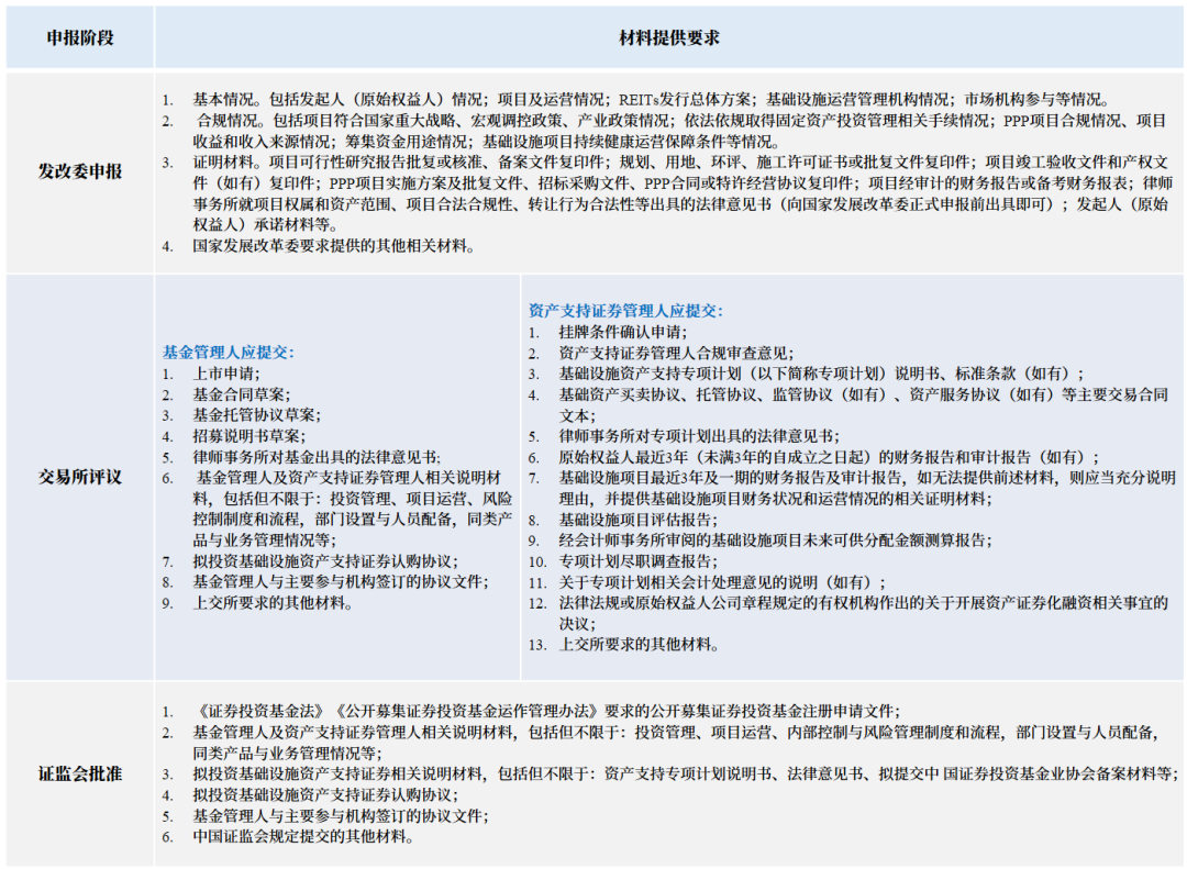 其二, 對市場機(jī)構(gòu)關(guān)注的公募REITs申請材料(見下方表格梳理)、無異議函等問題進(jìn)行了明確。公募REITs申請上市需提交的材料多于普通基金產(chǎn)品, 信息披露要求更高; 對于通過審核的公募REITs產(chǎn)品, 交易所將對資產(chǎn)支持證券及公募基金合并出具無異議函; 此外, 明確了公募REITs新購入基礎(chǔ)設(shè)施項目的, 則需向交易所提交變更申請并重新取得無異議函。
