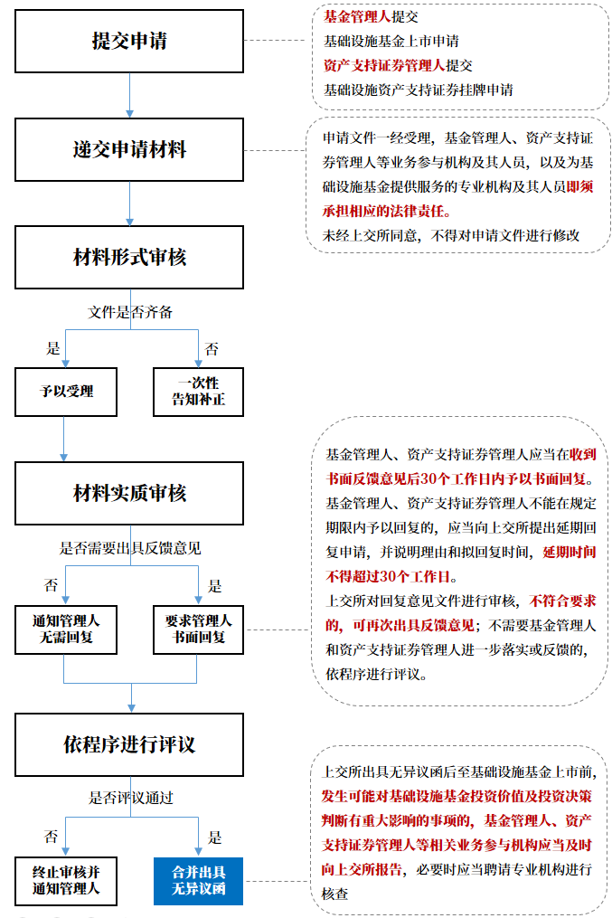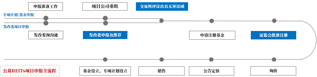 其一, 公募RETIs作為公募基金和資產(chǎn)支持證券相結(jié)合的產(chǎn)品, 上交所借鑒了此前對資產(chǎn)支持證券的管理經(jīng)驗, 結(jié)合公開證券發(fā)行的要求, 細(xì)化了對基礎(chǔ)設(shè)施資產(chǎn)支持證券的掛牌及基金上市的申請條件、協(xié)同盡調(diào)、申請文件等方面的要求, 同時明確了材料受理、審核與反饋所需時間。我們對公募REITs的申報全流程及上交所基本審核程序的梳理如下圖所示: