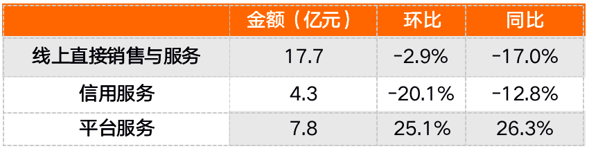 根據(jù)財(cái)報(bào),三季度樂信的電商業(yè)務(wù)GMV為12.8億元,同比下降3.3%,而二季度的GMV為15億元,所以三季度環(huán)比下降了14.7%;線上直接銷售與服務(wù)收入17.7億元,同比減少17%,環(huán)比減少2.9%。