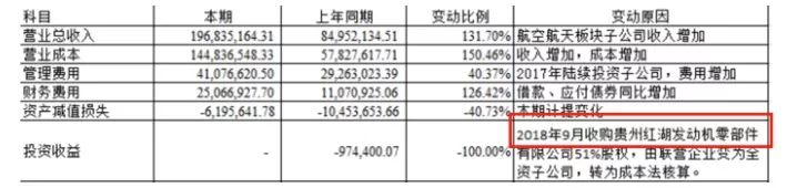 在公司2018年一季報中,公司在解釋投資收益變動原因時提到:“2018年9月收購貴州紅湖發(fā)動機有限公司51%股權,由聯(lián)營企業(yè)變?yōu)槿Y子公司,轉為成本法核算”,以下為財報截圖: