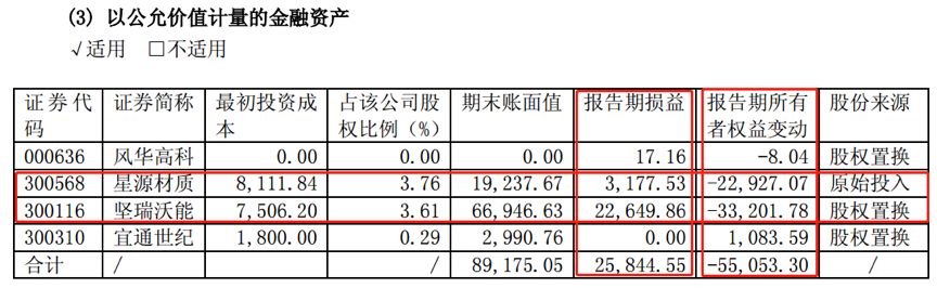 盡管,出售部分股權(quán)獲得了收益,但由于所持股權(quán)股價(jià)下滑,長(zhǎng)園集團(tuán)股權(quán)投資賬面價(jià)值大幅縮水(主要為堅(jiān)瑞沃能及星源材質(zhì)),這直接減少2017年所有者權(quán)益約5.5億。以下為公司2017年年報(bào)中披露的以公允價(jià)值計(jì)量的金融資產(chǎn)截圖: