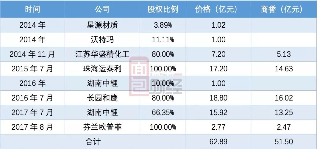 此后,又在2015年、2016年及2017年分別收購(gòu)了珠海運(yùn)泰利、湖南中鋰等多家相關(guān)公司。根據(jù)公開數(shù)據(jù)統(tǒng)計(jì),這4年間,長(zhǎng)園集團(tuán)在并購(gòu)上投入金額超過(guò)60億。以下為根據(jù)公開信息整理的主要收購(gòu)情況: