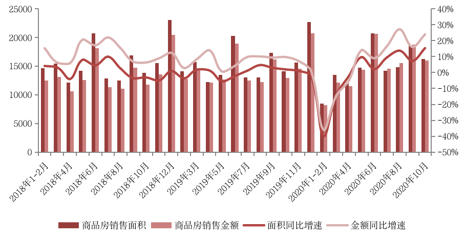 國家統計局數據顯示:2020年10月全國商品房銷售面積16221萬平方米,環比下降13%,銷售金額16018億元,環比下降14%。同比來看,2020年10月銷售面積與金額分別比2019年10月增加15%和24%,今年的“銀十”發力明顯。