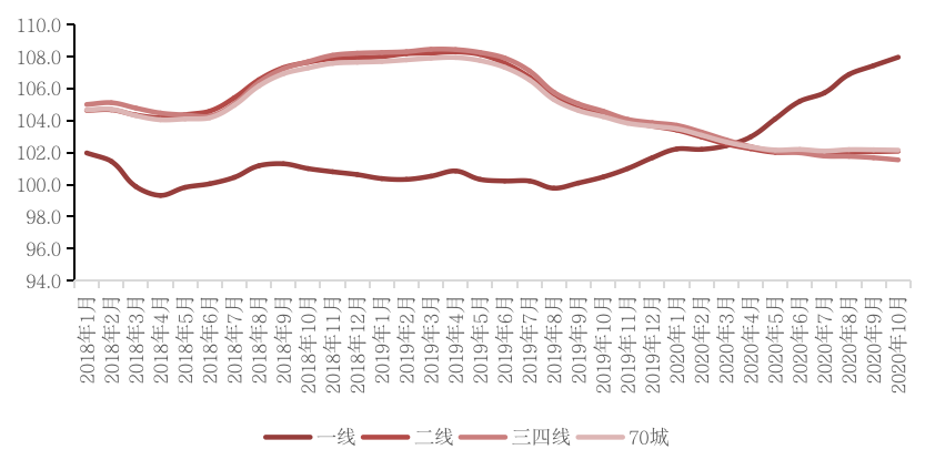 從全國70個大中城市商品住宅銷售價格來看,10月除一線城市同比漲幅繼續擴大外,其余二三線城市新房及二手房房價均同、環比漲幅收窄。具體來看,10月份,4個一線城市新建商品住宅銷售價格環比上漲0.3%,漲幅比上月回落0.1個百分點。其中,北京、上海、廣州和深圳分別上漲0.2%、0.3%、0.5%和0.2%。
