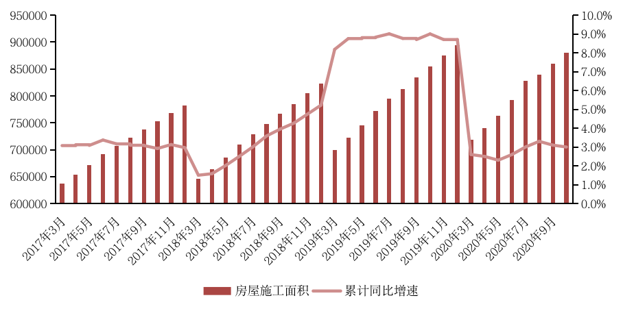 1-10月份,房地產開發企業房屋施工面積880117萬平方米,同比增長3.0%,增速比1-9月份回落0.1個百分點。其中,住宅施工面積621836萬平方米,增長3.8%。