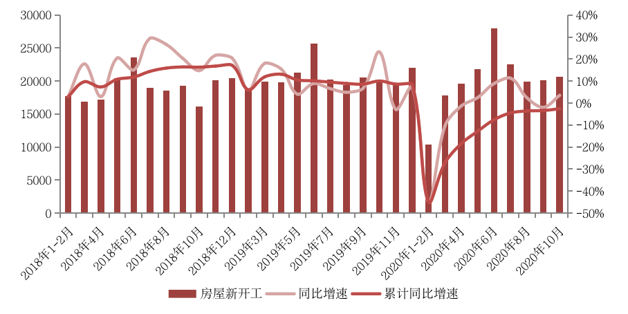 受中央融資“三條紅線”限制,房企迫切需要資金節流,但由于每年九、十兩月為傳統推盤旺季,再加上即將到來的年底銷售節點,項目新開工與加大建安投資也成為了各大房企的必然決策,因此10月房屋新開工面積同比單月由負轉正。