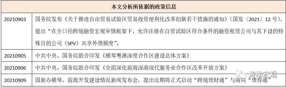 2021年9月5日與6日發(fā)布的兩個(gè)《方案》明確了兩大合作區(qū)未來15年(兩個(gè)方案均展望至2035年)的發(fā)展目標(biāo)與舉措,里面提出的一系列支持政策預(yù)計(jì)后續(xù)還會(huì)有相關(guān)配套細(xì)則出臺(tái),如9月9日央行副行長潘功勝便透露“央行正牽頭港澳金融管理部門制定金融支持兩地改革開放的專門文件”。同時(shí)考慮到廣州南沙新區(qū)、深圳前海蛇口以及珠海橫琴新區(qū)均屬于廣東自貿(mào)區(qū),因此這里將《關(guān)于推進(jìn)自由貿(mào)易試驗(yàn)區(qū)貿(mào)易投資便利化改革創(chuàng)新若干措施的通知》納入進(jìn)來。