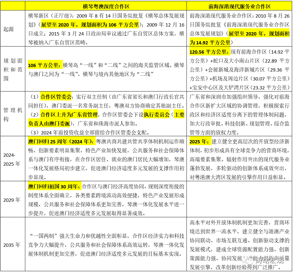 但有它們之間一些差異,主要體現(xiàn)在橫琴粵澳深度合作區(qū)的行政層級(jí)明顯提升(名義上升為廣東省管理、實(shí)際上澳門方面的權(quán)限更大),即橫澳合作區(qū)可以被看作是澳門島的擴(kuò)容、實(shí)際上是以澳門為主在管理;深港合作區(qū)則是原前海合作區(qū)的擴(kuò)容,主要為原前海合作區(qū)相關(guān)政策的平移、仍延續(xù)現(xiàn)行管理模式。