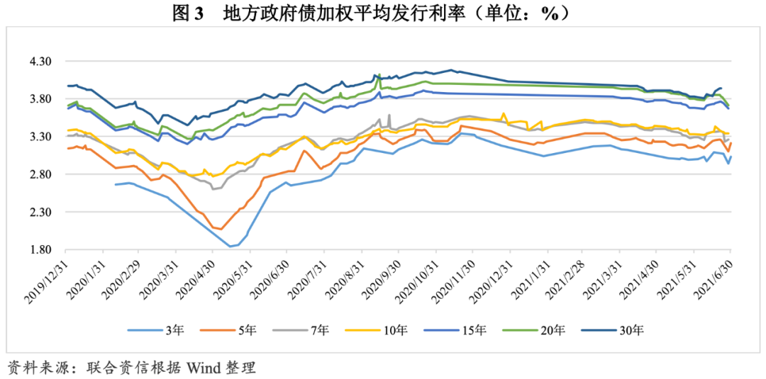 發行利率整體呈小幅下降走勢,期限利差同比有所收斂。發行利率方面,2021年上半年,央行繼續實施穩健的貨幣政策,綜合運用多種貨幣政策工具,通過公開市場操作、中期借貸便利(MLF)、定向中期借貸便利(TMLF)、常備借貸便利(SLF)以及央行票據互換等工具,合理安排工具搭配和操作節奏,維持市場流動性的合理充裕。在寬松適度的貨幣政策背景下,2021年上半年地方政府債券發行利率整體呈小幅下降走勢。一季度,地方政府債發行利率呈先降后升走勢(長期限地方政府債券發行利率相對穩定主要系發行較少導致樣本少所致),7年和10年期地方政府債的發行利率較為接近。二季度,各期限地方政府債券的發行利率波動均較大,6月底,10年及以下期限地方政府債券發行利率有所回升,15年及20年地方政府債券發行利率有所回落。