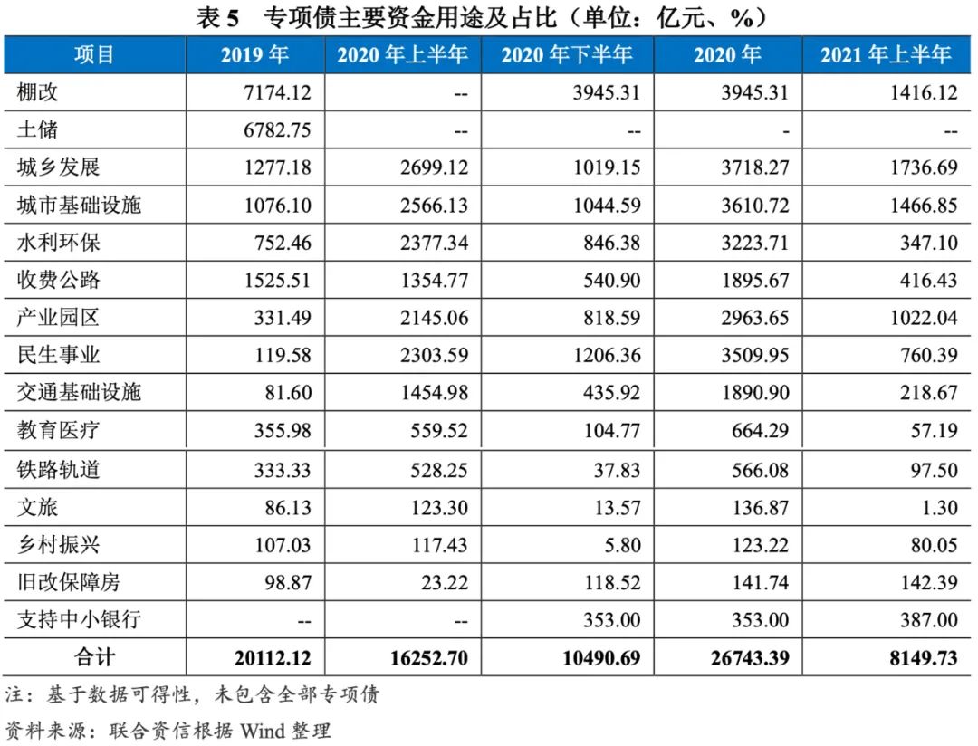2021年上半年,專項債募集資金主要投向結構較2020年全年變化不大,仍以基建類項目為主。同時,2021年上半年已有387.00億元專項債用于支持中小銀行發展,發行規模已超過2020年全年。2021年上半年,新增專項債發行速度放緩,其中用于水利環保、收費公路、民生事業、教育醫療、鐵路軌道等方向的專項債發行規模不足2020年全年發行規模的30%。2021年上半年,用于棚戶區改造的專項債規模占到當期項目收益類專項債的17.38%,上年同期無棚改專項債發行。
