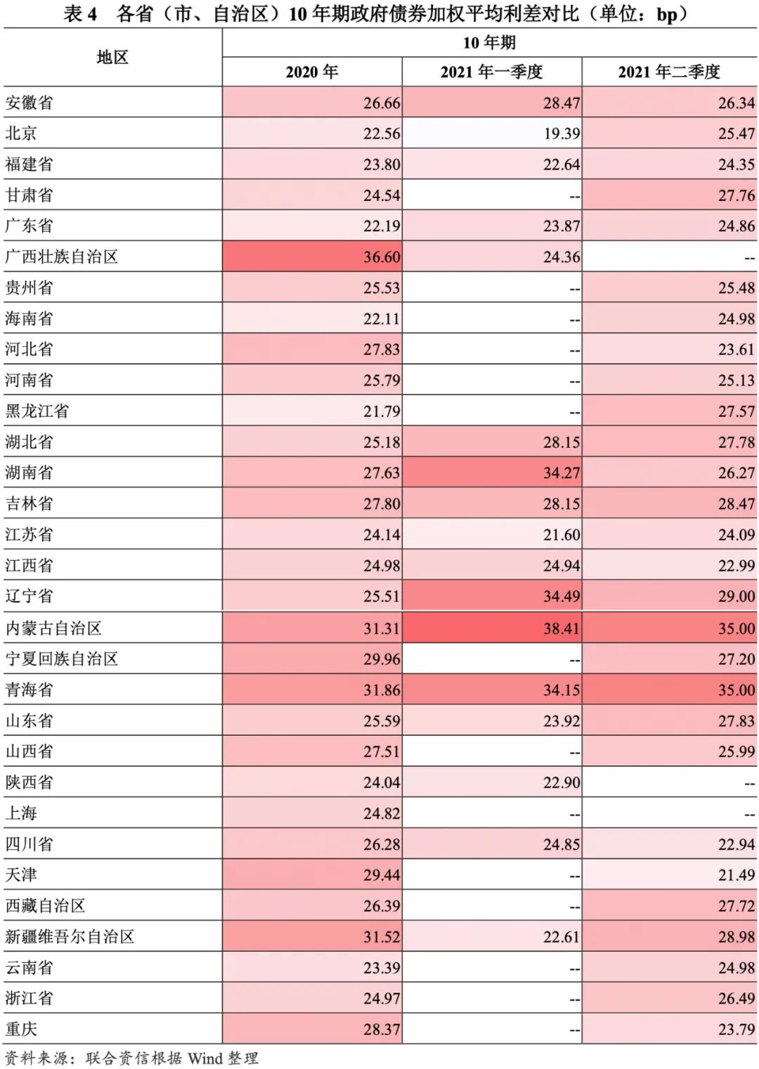 發行利差走勢有所分化,中長期品種的區域利差有所擴大。發行利差方面,以同期限中債國債到期收益率為基準,2021年一季度,10年及以下期限政府債券加權平均利差環比均有所下降,15年及以上期限政府債券加權平均利差環比有所上升或保持相對穩定;2021年二季度,除3年和7年政府債券外,其他期限政府債券加權平均利差環比均有所下降。分區域看,2020年以來,青海省和內蒙古自治區發行的中長期品種利差顯著高于其他區域;一季度,區域分化較上年度明顯走闊;二季度,中長期品種的區域利差有所收斂。與2020年相比,有近一半省(市、自治區)2021年二季度政府債券發行利差有所下降,其中天津市、重慶市和河北省發行利差降幅均超過4bp,天津市最高為7.95bp;黑龍江省、內蒙古自治區、遼寧省、甘肅省和青海省發行利差增幅超過3bp。
