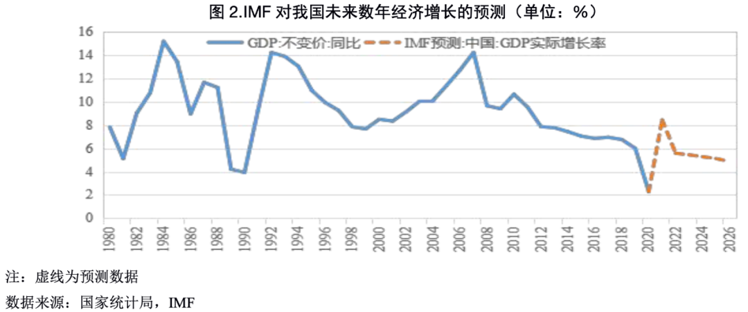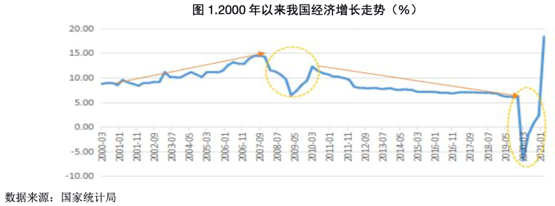 國際金融危機后,我國經濟增速在“四萬億”計劃的強刺激下迅速回升,于2010年一季度GDP增速恢復至12.2%的峰值以后,開啟了長期持續的下行趨勢,2019末下行至6%,下滑了6.2個百分點。2020年一季度,我國受新冠疫情沖擊,經濟活動急劇收縮,GDP同比下降6.8%,創上世紀70年改革開放以來新低。隨后國內疫情迅速得到控制,經濟逐漸穩步復蘇,2020年全年GDP增速為2.3%,成為全球唯一正增長的主要經濟體,但仍處于較低增長水平。