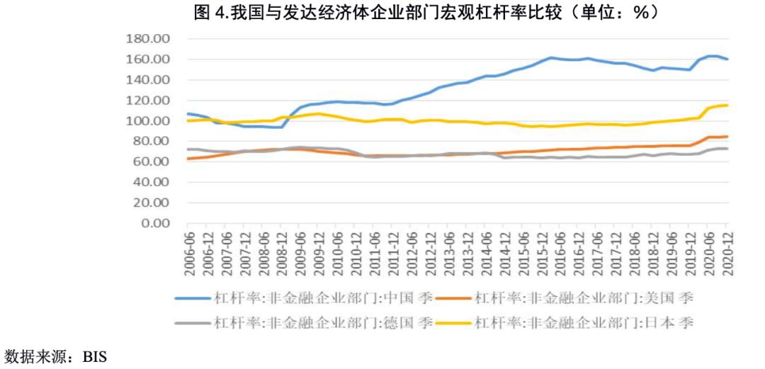 我國企業部門杠桿率一直處于較高水平,疫情發生后監管層為了穩企保崗,支持企業渡過難關,迅速注入流動性,放松信用條件,企業部門宏觀杠桿率迅速攀升,2020年6月末達到165.2%的歷史最高值。此后,杠桿率雖然有所下降,但仍然維持在歷史較高水平(2021年一季度末為161.40%)。BIS數據顯示,2020年末我國非金融企業部門宏觀杠桿率為160.70%, 同期美國、日本、德國非金融企業部門的宏觀杠桿率分別為84.60%、115.6%和73.2%,均遠低于我國。后疫情時期,我國經濟恢復對債務驅動的依賴依然較強,經濟增長的基礎不夠牢固,因而具有一定的脆弱性,易受國內國際風險事件的沖擊,或將持續面臨防范化解風險的較大壓力。