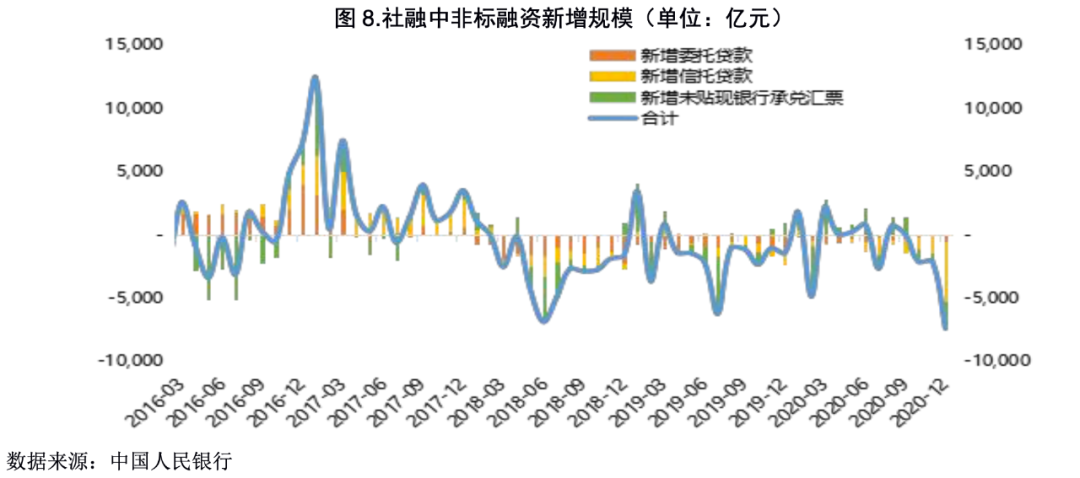 另外,需關注2021年非標融資縮量對企業流動性的壓力。2018年以來新增非標融資出現了負增長的趨勢,企業的融資渠道逐步縮窄。自2020年四季度以來,非標融資縮量程度再次加深,資管新規過渡期延長至2021年底,2021年也將大概率延續縮量趨勢,將對信用債的償付能力產生負面影響,尤其是通過非標融資較多的城投和房地產企業。