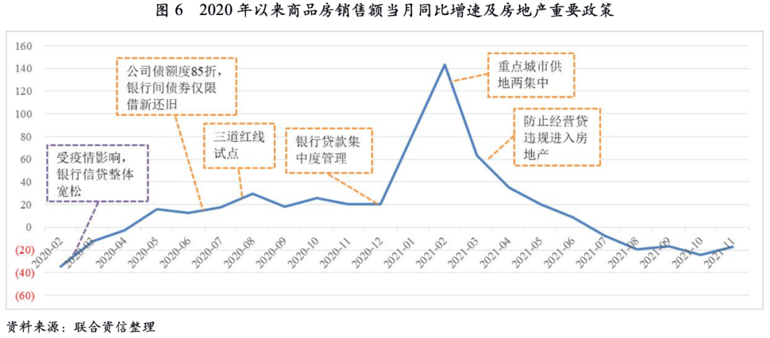 暫不考慮受疫情影響較大的2020年1-5月及2021年1-5月數(shù)據(jù),2020年至2021年上半年期間,房地產(chǎn)周期走勢相對平穩(wěn),市場仍然具備一定韌性。期間,房地產(chǎn)融資端的管控進(jìn)一步收緊,尤其是“三道紅線”對房企有息債務(wù)增長直接進(jìn)行限制,這種與金融業(yè)類似的監(jiān)管手段,體現(xiàn)了政府對于“房住不炒”、地產(chǎn)去金融化的決心。此外,房企債券額度和募集資金用途再度收緊、銀行貸款集中度管理等政策,體現(xiàn)了監(jiān)管層將降杠桿作為本階段房地產(chǎn)調(diào)控的重點(diǎn)。