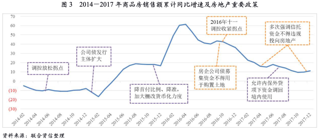 隨著熱點(diǎn)城市房價(jià)迅速上漲,2016年10月起,房地產(chǎn)調(diào)控政策開始轉(zhuǎn)向。一方面,調(diào)控政策由全國性調(diào)控改為因城施策,調(diào)控手段不斷創(chuàng)新,由需求端調(diào)控發(fā)展到供給端調(diào)控;另一方面,房企融資需要進(jìn)一步規(guī)范,尤其是對房企以公司債募集資金購置土地、銀行表外通道等進(jìn)行限制。在兩方面政策的結(jié)合下,房地產(chǎn)市場在2016年10月后顯著降溫,2017年行業(yè)增速恢復(fù)至較為平穩(wěn)的水平。