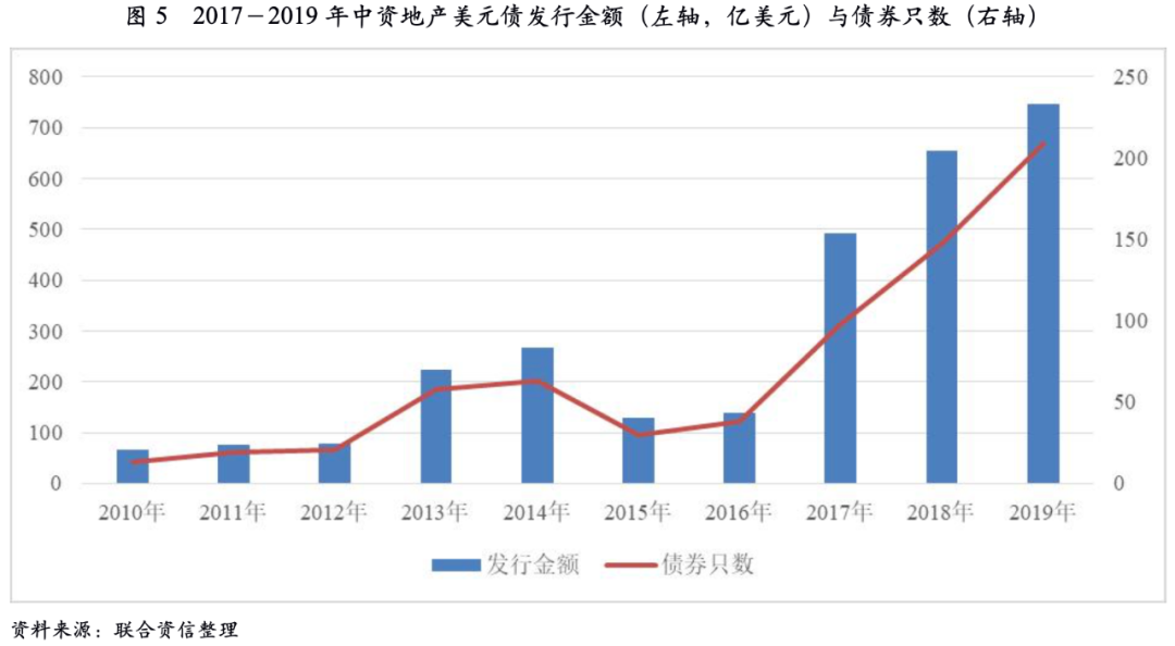 從這個(gè)階段的周期走勢可以看出,雖然行業(yè)整體呈下行趨勢,但下行的幅度一般。地產(chǎn)依然保有韌性的重要原因之一是美元債融資快速增長。美元債融資渠道的暢通,使得許多房企在三四線市場下行、利潤率下滑、境內(nèi)融資收緊的不利環(huán)境下,仍然具備流動(dòng)性。在行業(yè)集中度提升的必然趨勢下,許多房企將“規(guī)?!币暈樵谛袠I(yè)中存活下去最重要的因素,利用美元債進(jìn)一步加杠桿,在追求規(guī)模的道路上犧牲了企業(yè)財(cái)務(wù)健康,埋下風(fēng)險(xiǎn)隱患。