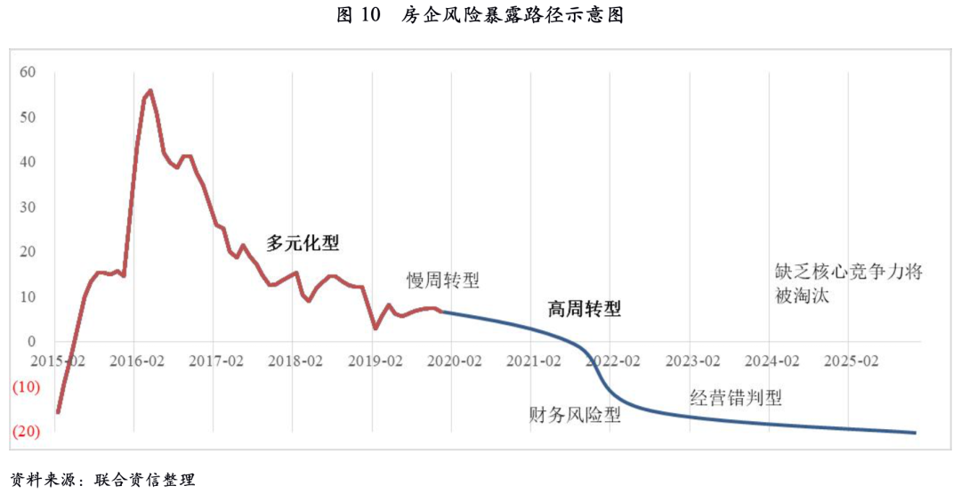 本階段的違約房企以高杠桿且經(jīng)營回款相對較慢的大中型房企為主。與2018-2019年階段違約的房企不同,本階段的違約房企大多在產(chǎn)品和規(guī)模方面具備一定的競爭力,但受項(xiàng)目業(yè)態(tài)(如豪宅、產(chǎn)業(yè)新城、商業(yè)地產(chǎn)等)或土地來源(如舊改)等因素影響,去化和回款速度較慢。這些房企在信貸寬松時(shí)期依賴高杠桿維持正常運(yùn)營,2018年起隨著融資趨緊開始出現(xiàn)流動(dòng)性問題,經(jīng)歷2~3年的流動(dòng)性消耗后暴露風(fēng)險(xiǎn)。