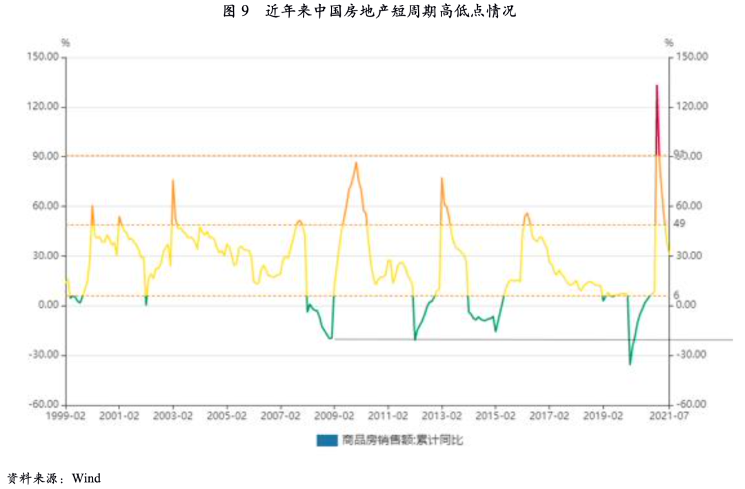 上文我們對房地產(chǎn)短周期規(guī)律和本輪短周期進(jìn)行了回顧。與此前幾輪短周期“快上快下”的走勢相比,本輪周期下行階段顯著拉長,我們判斷本輪短周期尚未觸底。在2015年的周期低點(diǎn)上,棚改貨幣化等政策的推出有力推動(dòng)了房地產(chǎn)周期進(jìn)入復(fù)蘇階段;但在房地產(chǎn)長效調(diào)控機(jī)制逐步建立、房地產(chǎn)金融審慎管理的現(xiàn)階段,在中長周期內(nèi)下行趨勢的壓力下,預(yù)計(jì)本輪周期的低點(diǎn)至少應(yīng)抵達(dá)前3輪短周期的低點(diǎn)位置,即累計(jì)同比降幅20%。2021年7月以來,商品房銷售額單月同比降幅已觸及20%并持續(xù)在該水平波動(dòng),但由于上半年的小陽春,累計(jì)同比增速仍為正數(shù),本輪短周期的下行仍將持續(xù)一段時(shí)間。