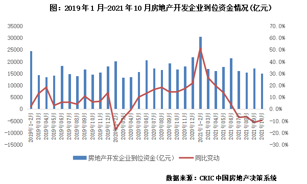 但根據CRIC監測,自9月以來,市場上的“工抵房”數量激增,主要是有兩個原因:市場轉冷,房企去化不暢甚至庫存積壓,影響企業回款。根據CRIC數據,2021年10月,房地產市場持續降溫,10月TOP100房企單月操盤業績規模同比下降32.2%,自7月以來已經連續4個月呈現同比下跌的態勢。調控升級房企融資收緊,發債受阻,房企開發到位資金連續4個月同比下降。從統計局公布的數據來看,自2021年7月開始,房地產開發企業到位資金總額已經連續4個月呈現下降趨勢。近3年以來,除疫情期間的2020年1-3月,這一數值均呈現同比增長趨勢,此番連續下降,可見房企壓力之大。