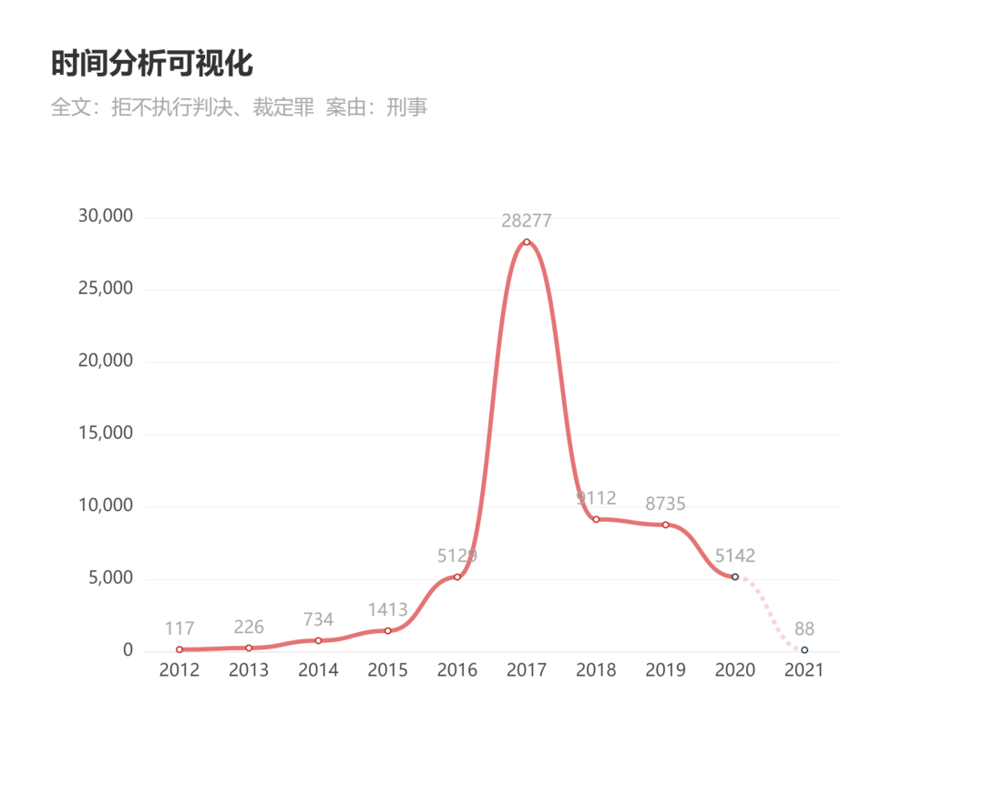 根據(jù)第三方數(shù)據(jù)平臺的裁判文書數(shù)據(jù)顯示,拒執(zhí)罪在2016年前基本沒有太多應(yīng)用。2016年到2020年期間,呈上升態(tài)勢,但也均未超過1萬(注:2017年數(shù)據(jù)28277件中,河南省貢獻(xiàn)25381件,屬于當(dāng)年的個別偏差現(xiàn)象)。