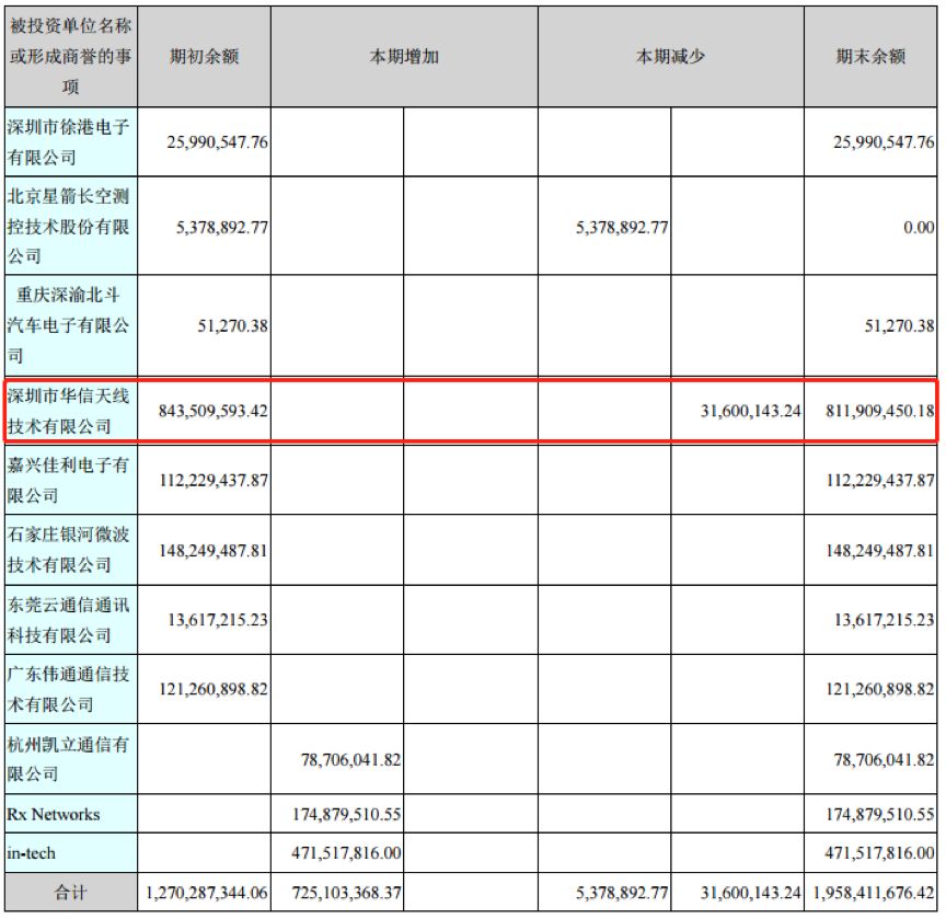 這筆商譽的形成要追溯到2015年。2015年7月,北斗星通以發行股份及支付現金相結合的方式購買華信天線100%股權,交易對價10億元,合并形成商譽約8.44億元。