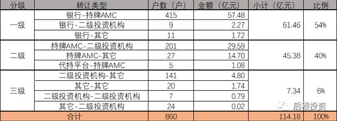 根據(jù)行業(yè)慣例把銀行(信托)出包定為一級(jí)市場(chǎng),AMC收包、出包,代持平臺(tái)出包定為二級(jí)市場(chǎng),其它民營(yíng)投資機(jī)構(gòu)為三級(jí)市場(chǎng),并且把3戶以上的受讓、出讓方定為二級(jí)投資機(jī)構(gòu)。