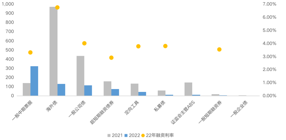 受疫情反復,當前市場不穩定因素較多影響,一般中期票據和超短期融資債券等久期較短的債券成為市場發行的絕對主力,占比分別為45%、11%,合計占比接近6成。