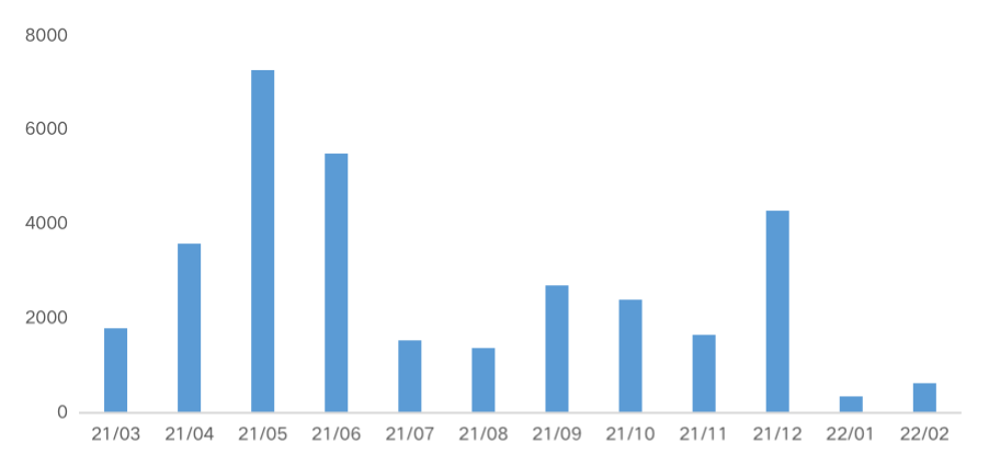 2022年1-2月,國資房企仍為境內外發債主力,民營房企發債融資占比略有上升,由Q4的15%升至28%,接近去年Q3水平。為應對即將到期的海外債,禹洲集團發行1年期7.81%票息4.53億美元新票據以交換本金總額為4.77億美元的交換票據,為民企1-2月債券融資單筆規模最高。