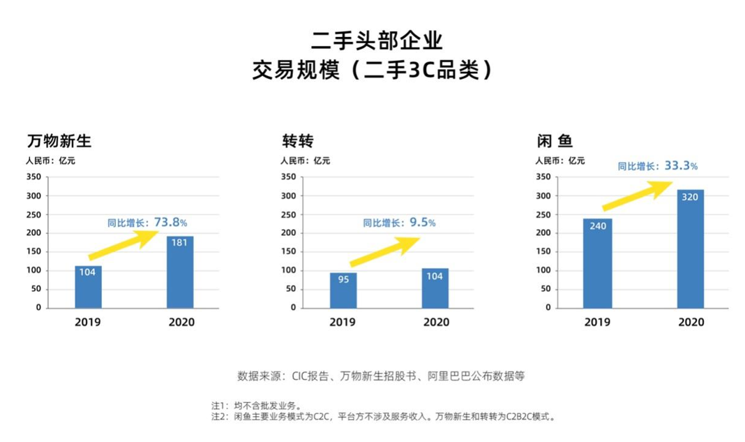 CIC數據顯示,閑魚、萬物新生、轉轉在2020年二手3C產品GMV分別為320億元、181億元、104億元,分別較去年同期增長33.3%、73.8%和9.5%。