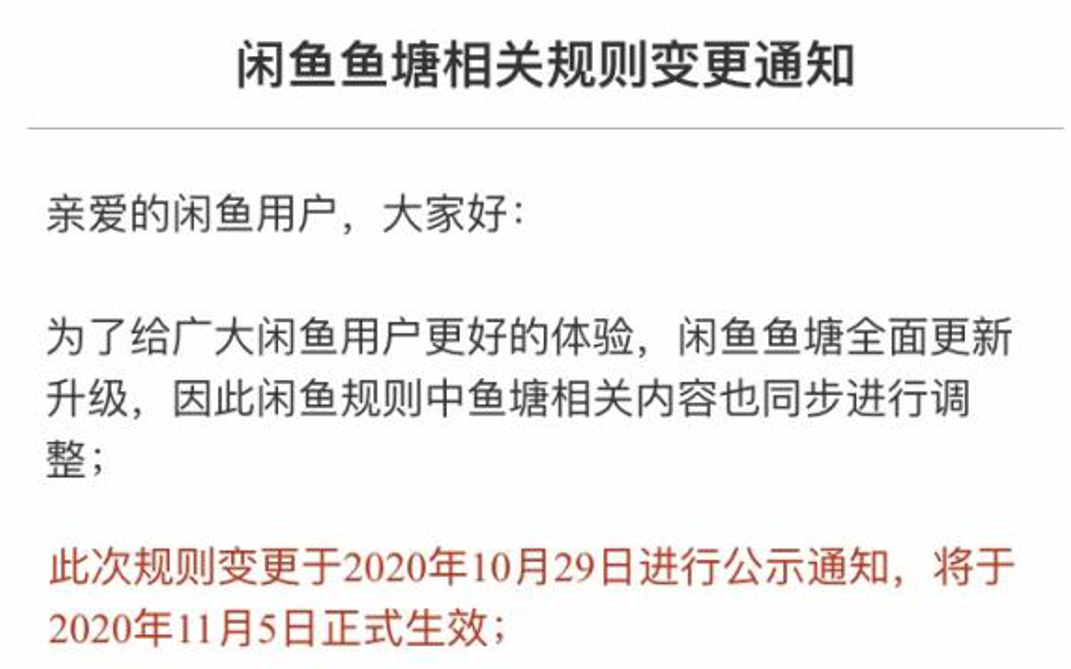 2020年10月底,閑魚正式發布公告,直播業務、魚塘業務等過去的重要入口相繼被取消。截至2020年8月,閑魚已有各類魚塘超40萬個。