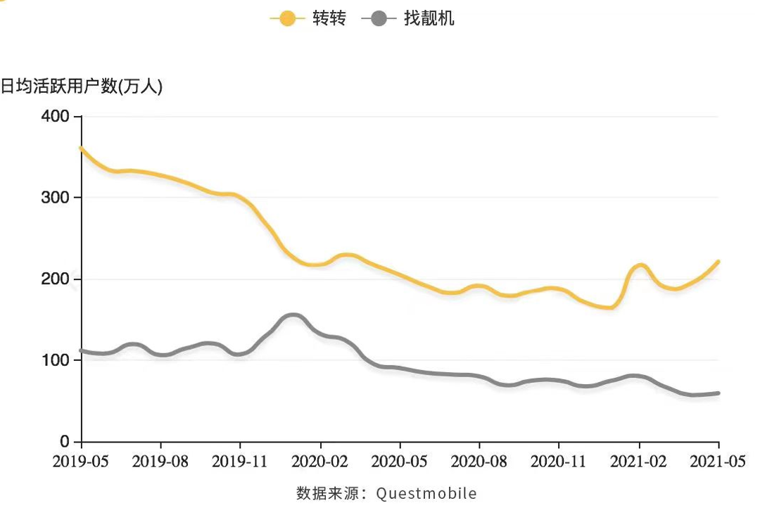 2019年,轉轉開啟第三次轉型之路,將發展方向聚焦于二手3C市場,并在2020年5月收購二手手機B2C平臺“找靚機”,轉型成為二手3C垂類電商。但收購之后轉轉的月活用戶卻在持續下降,最近兩年的降幅更是達到40%。