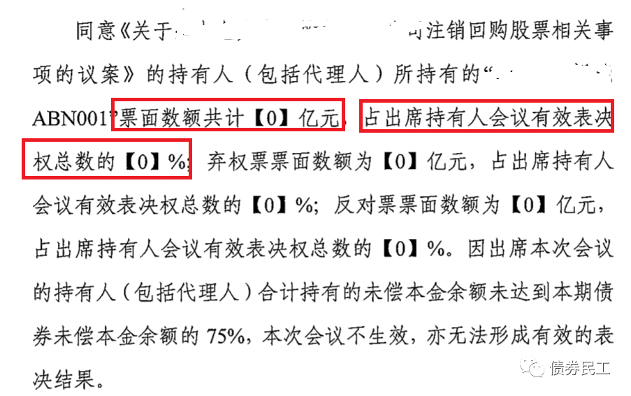 當然,這并不是第一個債券持有人零參與的持有人會議。之前披露的公告中,某個ABN參會債券持有人持有債券金額占存續債券總額的0%,也是持有人另參與。