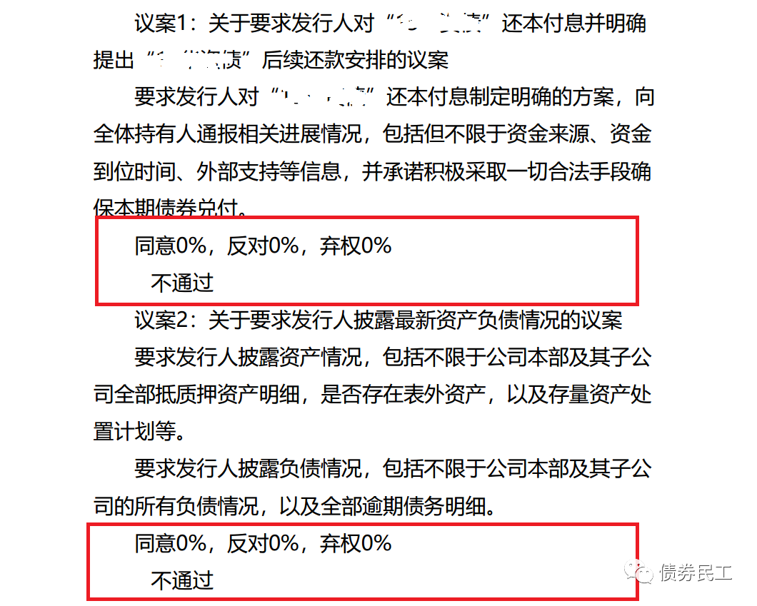 根據某債券發行人2022年2月14日的公告信息,公司召開的持有人會議需要表決的兩個議案,兩項表決均是債券持有人同意0%,反對0%,棄權0%,實現了債券持有人的零參與。雖然這個發行人已經債券違約了,但是債券持有人會議還是要重視的,這種結果也是很少見的。