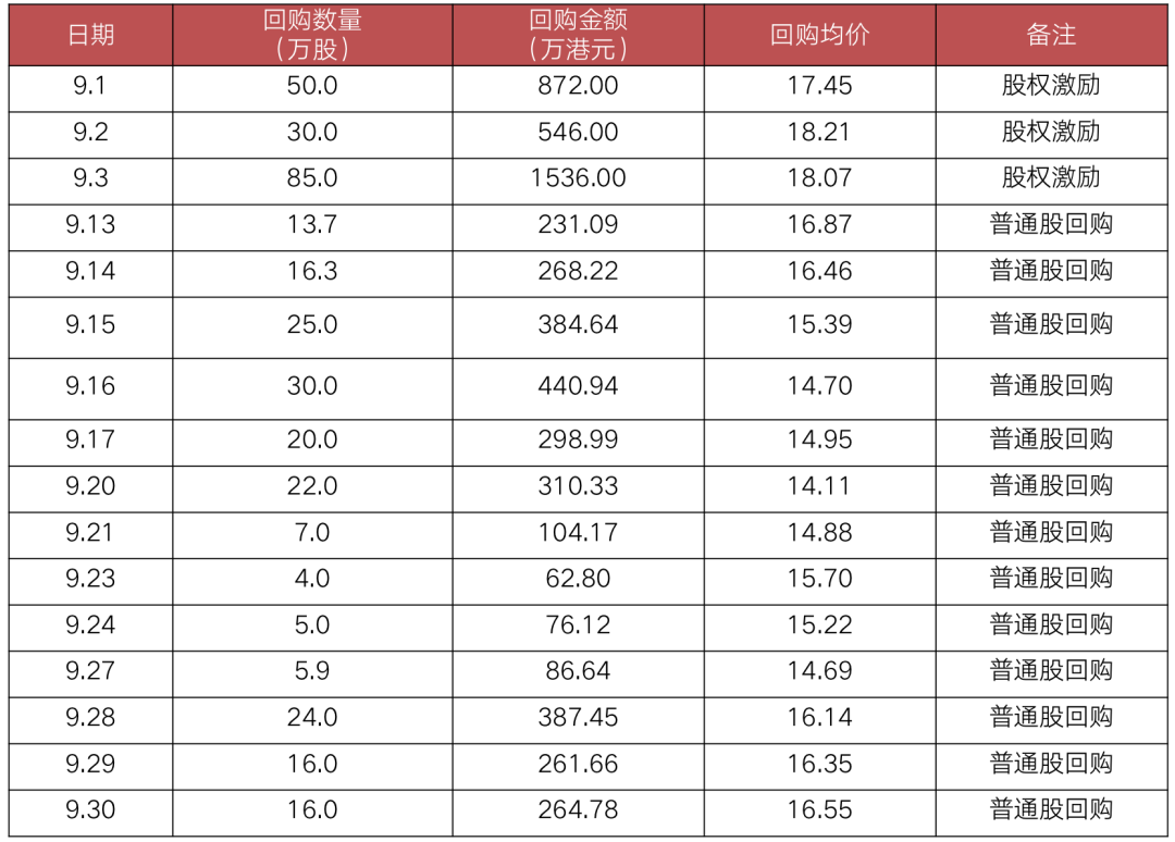 尤其是新城悅服務,自7月6日開始,新城悅服務持續(xù)用“股份激勵計劃的受托人買入”和“公司回購”兩種方式從二級市場買入公司股份。其中,9月份回購次數(shù)16次,涉及金額6131.83萬港元。