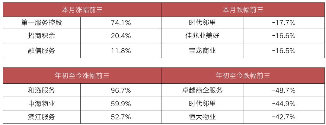 其中,本月股價漲幅前三的物企分別為第一服務控股、招商積余和融信服務;跌幅最多的三家物企分別為時代鄰里、佳兆業(yè)美好和寶龍商業(yè)。