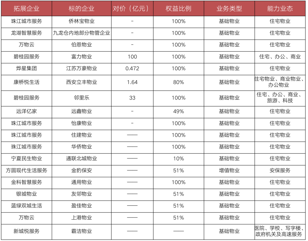 提及收并購,今年首當其沖的便是碧桂園服務:2月25日,以48.47億元收購藍光嘉寶服務64.62%股權(quán),開創(chuàng)首例上市物企間的并購,48.47億元的價格也創(chuàng)下了彼時業(yè)內(nèi)的收購記錄。9月20日,碧桂園服務發(fā)布公告稱以不超過100億元收購富力物業(yè),9月28日,發(fā)布公告稱以不超過33億元收購彩生活服務核心資產(chǎn)鄰里樂控股。