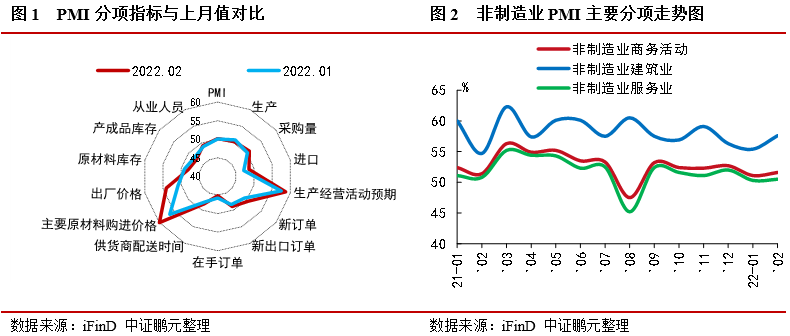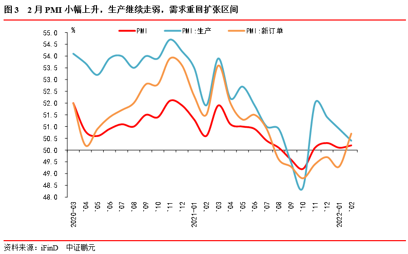 一,PMI小幅上行,新訂單指數(shù)重回擴張區(qū)間,需求強,生產(chǎn)弱,預(yù)期強。2月PMI指數(shù)為50.2%,小幅上升0.1個百分點,非制造業(yè)商務(wù)活動指數(shù)為51.6%。受季節(jié)性和春節(jié)因素影響,生產(chǎn)指數(shù)為50.4%,比上月下降0.5個百分點,生產(chǎn)雖小幅放緩但仍高于臨界點;生產(chǎn)經(jīng)營活動預(yù)期為58.7%,較上月大幅增加1.2個百分點,穩(wěn)增長預(yù)期強。新訂單指數(shù)為50.7%,比上月上升1.4個百分點,需求端時隔6個月重回擴張區(qū)間。主要原材料購進價格和出廠價格大幅上漲。