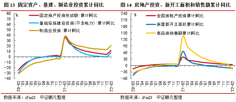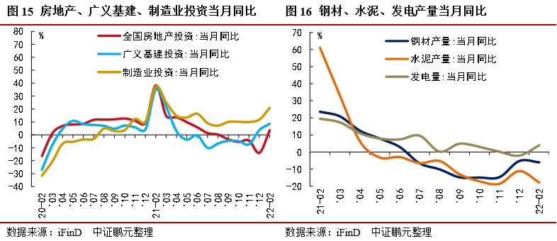 五,制造業(yè)投資保持兩位數(shù)增長,基建投資有所好轉(zhuǎn),房地產(chǎn)投資雖有上升但銷售和開工仍低迷。1-2月份,制造業(yè)投資增速為20.9%,主要受基數(shù)影響。狹義基建投資增速8.1%,比2021年全年加快7.7個百分點,比2021年12月高8.7個百分點。廣義基建投資增速為8.6%,比2021年12月高4.8個百分點,基建投資增速回暖,因穩(wěn)增長背景下,政策發(fā)力靠前。房地產(chǎn)投資當(dāng)月同比大幅回暖,商品房銷售和房屋新開工不景氣,鋼材、水泥產(chǎn)量負增長進行了驗證。