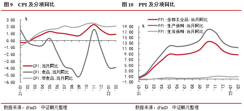 三,CPI同比持平走低,環(huán)比漲幅略有擴大;PPI同比繼續(xù)回落,環(huán)比由跌轉(zhuǎn)升,警惕輸入性通脹風(fēng)險。CPI同比上漲0.9%,與上月持平,核心CPI同比上漲1.1%,漲幅比上月回落0.1個百分點,CPI環(huán)比上漲0.6%,漲幅比上月擴大0.2個百分點。PPI同比上漲8.8%,環(huán)比上漲0.5%。近期俄烏沖突地緣政治影響下原油等大宗商品大幅上漲,疫情造成的產(chǎn)業(yè)鏈未完全恢復(fù),警惕輸入性通脹風(fēng)險,今年CPI預(yù)計溫和上漲,PPI預(yù)計逐漸回落。