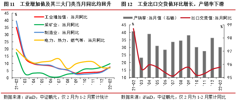 1-2月份,規(guī)模以上工業(yè)增加值同比增長7.5%,較2021年12月份加快3.2個百分點,較2021年兩年平均增速加快1.4個百分點。從環(huán)比看,2月份,規(guī)模以上工業(yè)增加值比上月增長0.34%。工業(yè)生產(chǎn)延續(xù)去年四季度以來逐月回升態(tài)勢,多數(shù)行業(yè)生產(chǎn)增速有所加快,工業(yè)出口繼續(xù)兩位數(shù)增長。