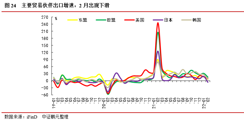 歐盟、東盟、美國為前三大主要貿(mào)易伙伴,對主要貿(mào)易國增速出現(xiàn)下滑。前2個月,與歐盟貿(mào)易總值為8,746.4億元,增長12.4%,占我外貿(mào)總值的14.1%。其中,對歐盟出口增長21.4%,對歐盟進口下降2%。與東盟貿(mào)易總值為8,704.7億元,增長10.5%,占14%。其中,對東盟出口增長10.6%,自東盟進口增長10.3%。中美貿(mào)易總值為7,859.2億元,增長9.7%,占12.7%。其中,對美國出口增長11.1%,自美國進口增長5.8%;從單月出口增速來看,2月對歐盟、東盟、美國、日本、韓國出口增速為15.4%、5.9%、9.7%、-6.4%、6.7%,1月數(shù)值為31.2%、18.2%、16.9%、18.5%、26.5%,2021年12月數(shù)值為25.6%、12.0%、21.2%、8.6%、27.4%,對主要貿(mào)易國增速出現(xiàn)下滑。