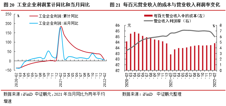 1-2月份,全國規(guī)模以上工業(yè)企業(yè)實現(xiàn)利潤總額11,575.6億元,同比增長5.0%,增速較去年12月份回升0.8個百分點。按可比口徑來看,1-2月工業(yè)企業(yè)利潤較去年12月當(dāng)月同比下滑7個百分點(去年12月兩年平均增速為12.0%),主因2021年高基數(shù)影響。總體來看,工業(yè)企業(yè)效益狀況延續(xù)了去年以來的恢復(fù)態(tài)勢。工業(yè)企業(yè)利潤增速受基數(shù)較高影響較去年全年明顯回落,企業(yè)成本壓力加大,利潤率和產(chǎn)銷銜接水平均有所下降;企業(yè)盈利改善仍不均衡,下游行業(yè)尤其是中小微企業(yè)利潤增長緩慢,企業(yè)生產(chǎn)經(jīng)營還面臨不少困難和挑戰(zhàn),工業(yè)企業(yè)效益狀況持續(xù)恢復(fù)的基礎(chǔ)仍不牢固。