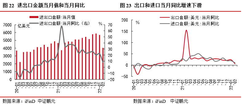 2022年1月1日,全球最大的自貿(mào)區(qū)RCEP正式生效,RCEP紅利釋放,關(guān)稅優(yōu)惠凸顯,企業(yè)積極性高,前2月進出口保持一定增長,后續(xù)具有韌性。影響出口增長不利因素一是俄烏沖突等導(dǎo)致大宗商品價格上漲,壓縮企業(yè)利潤,地緣政治將會持續(xù)干擾。另一方面是新冠疫情的影響,此前中國的動態(tài)清零措施和防疫的成功經(jīng)驗為出口增加了有利條件,但此次奧密克戎2.0具有高傳染性和低致死率,在國外普遍放開的情況下,我國的動態(tài)清零政策面臨挑戰(zhàn)和壓力,隨著主要出口國家供應(yīng)鏈的恢復(fù),在內(nèi)外交困下,我國出口將面臨下滑趨勢。